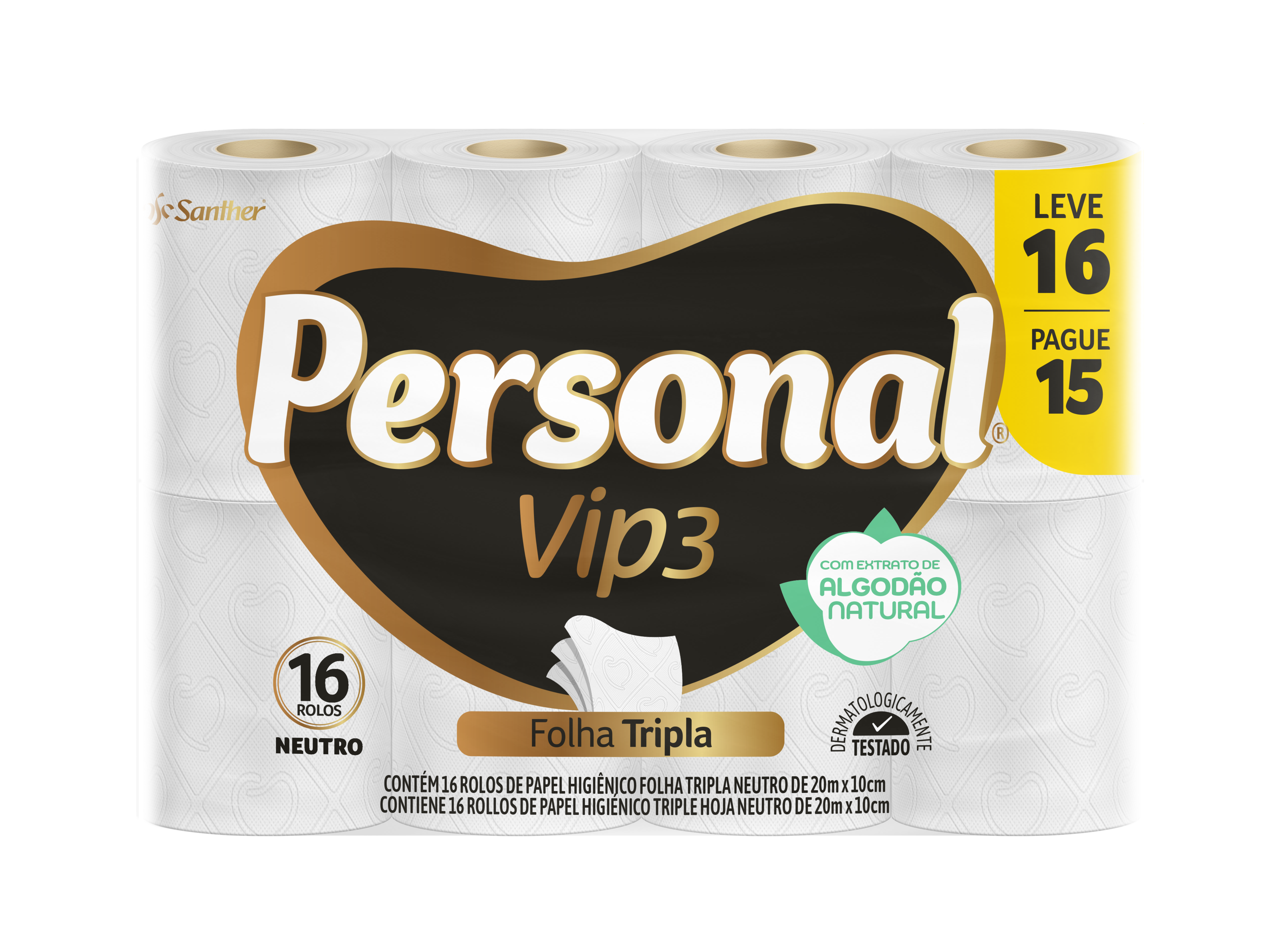 Chegou o novo PERSONAL® VIP3 ! O papel higiênico 3 folhas com Extrato Natural de Algodão em três camadas de fibras naturais que proporcionam uma textura suave, associando maciez e toque de algodão com a resistência das fibras, para um equilíbrio perfeito entre conforto e absorção.